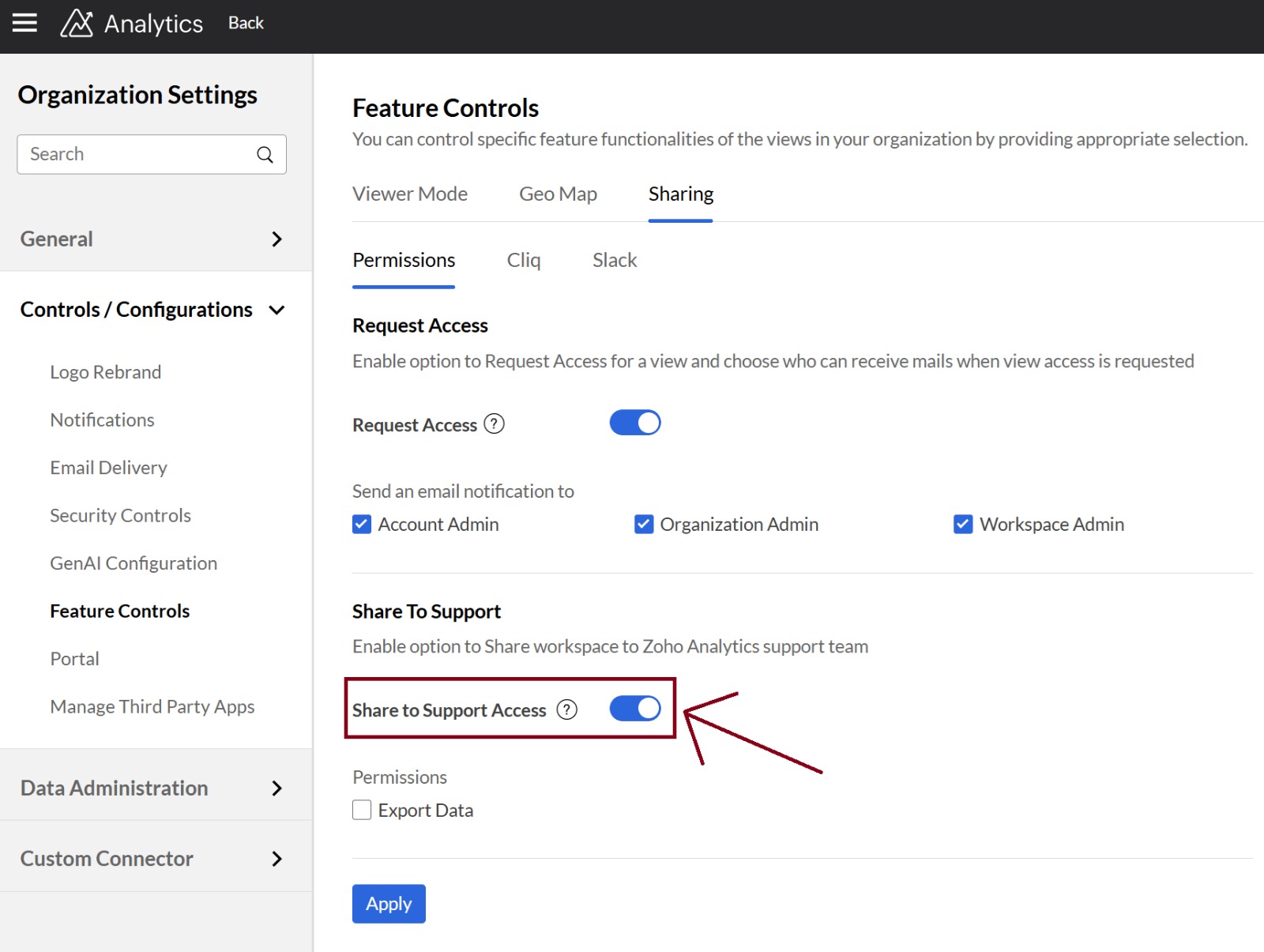 - Enable the Share to Support Access toggle button to allow the admins to share the workspace with the Zoho Analytics support team.